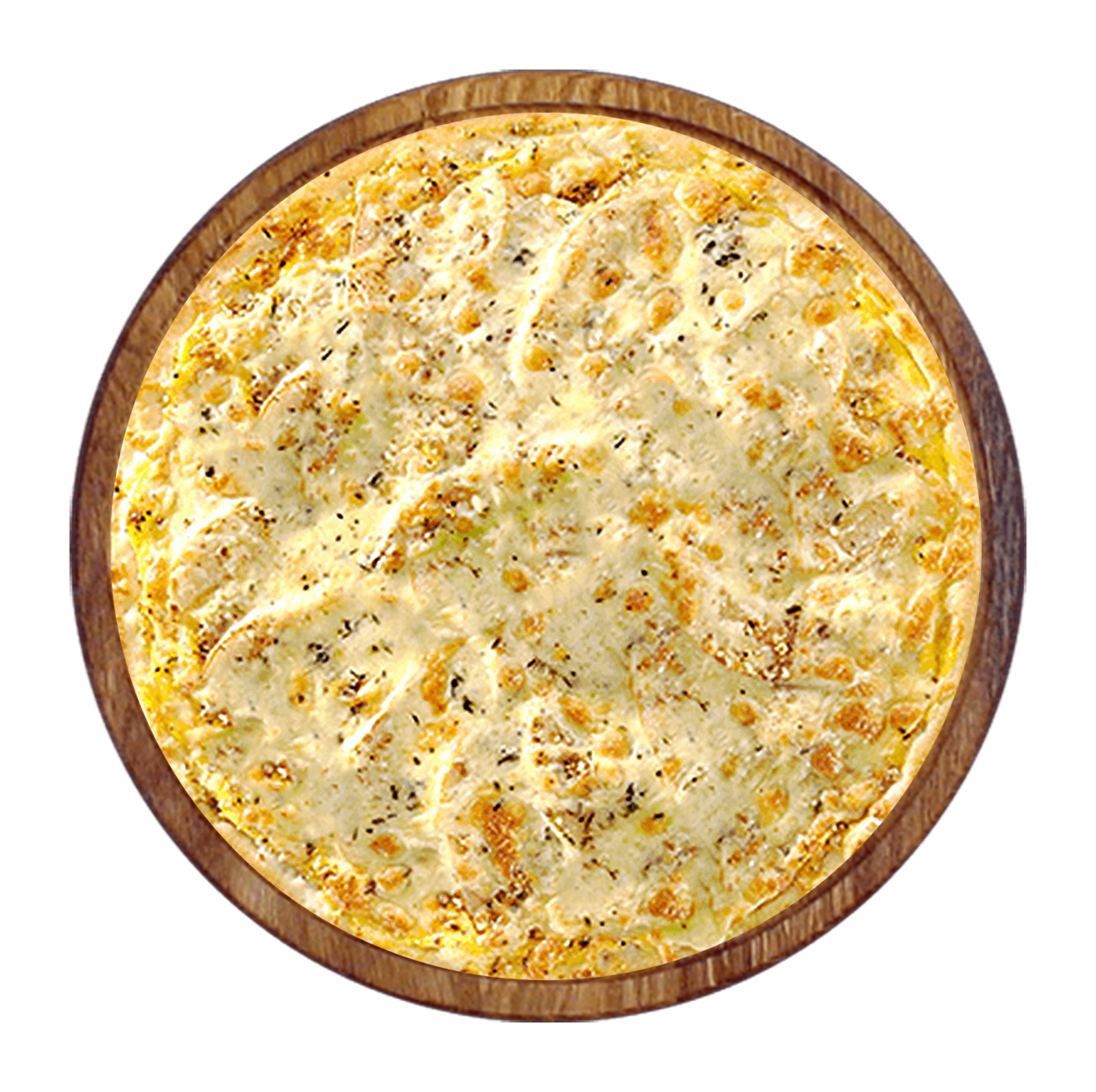 Sauce fromagère, mozzarella, escalope, poivrons, pommes de terre, olives.